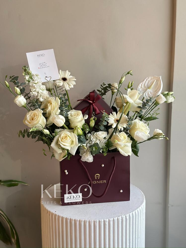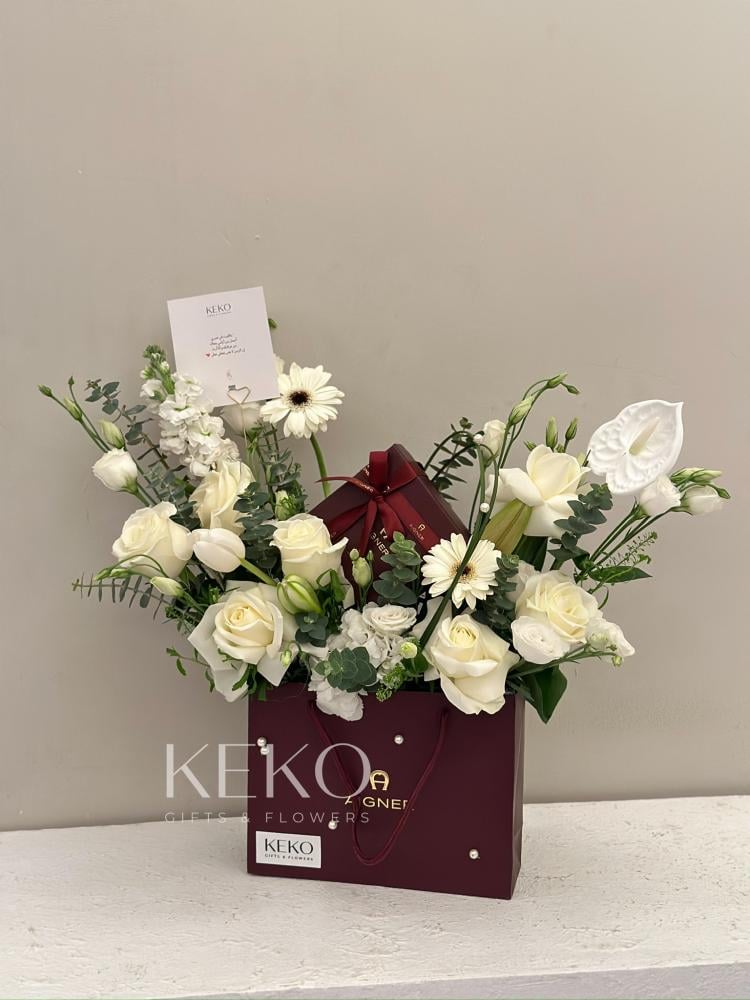 تترافق المحفظة مع تنسيق من الورود البيضاء الجميلة، مما يضيف لمسة من الرومانسية والجمال إلى الهدية. هذه المجموعة تمثل خيارًا مثاليًا لمناسبات مثل أعياد الميلاد، ذكرى الزواج، أو أي مناسبة خاصة أخرى، مما يجعلها هدية مميزة لكل رجل أنيق.